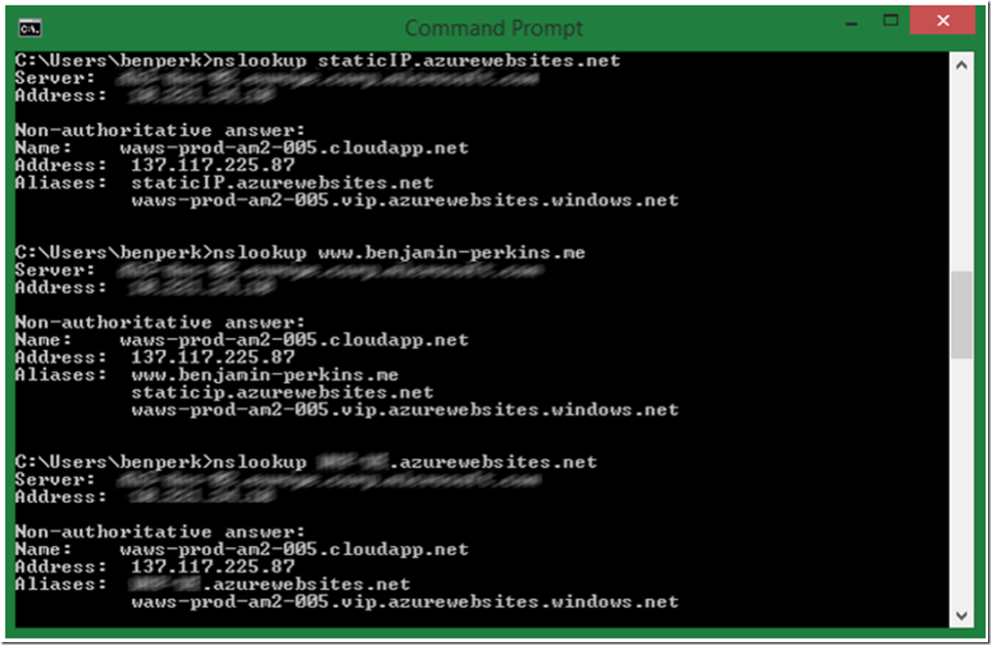 When you host your web site on the Azure Web App platform it is bound to a virtual IP address that is shared with other web sites in that region stamp. See in Figure 1 where I performed an NSLOOKUP of a few of my test Web App sites, they return the same IP address. Sometimes you might need or want your own static IP address for your web site. This article explains how you can do that.