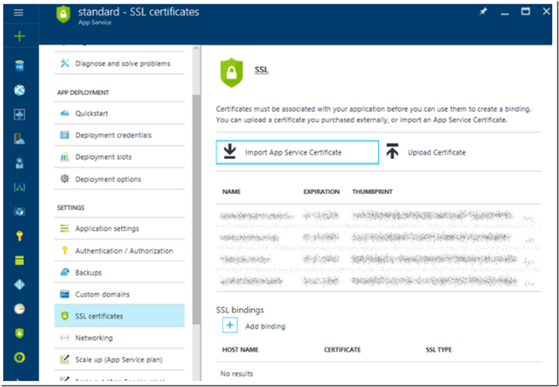 Figure 3, uploading and configuring a self-signed certificate on Azure Web App