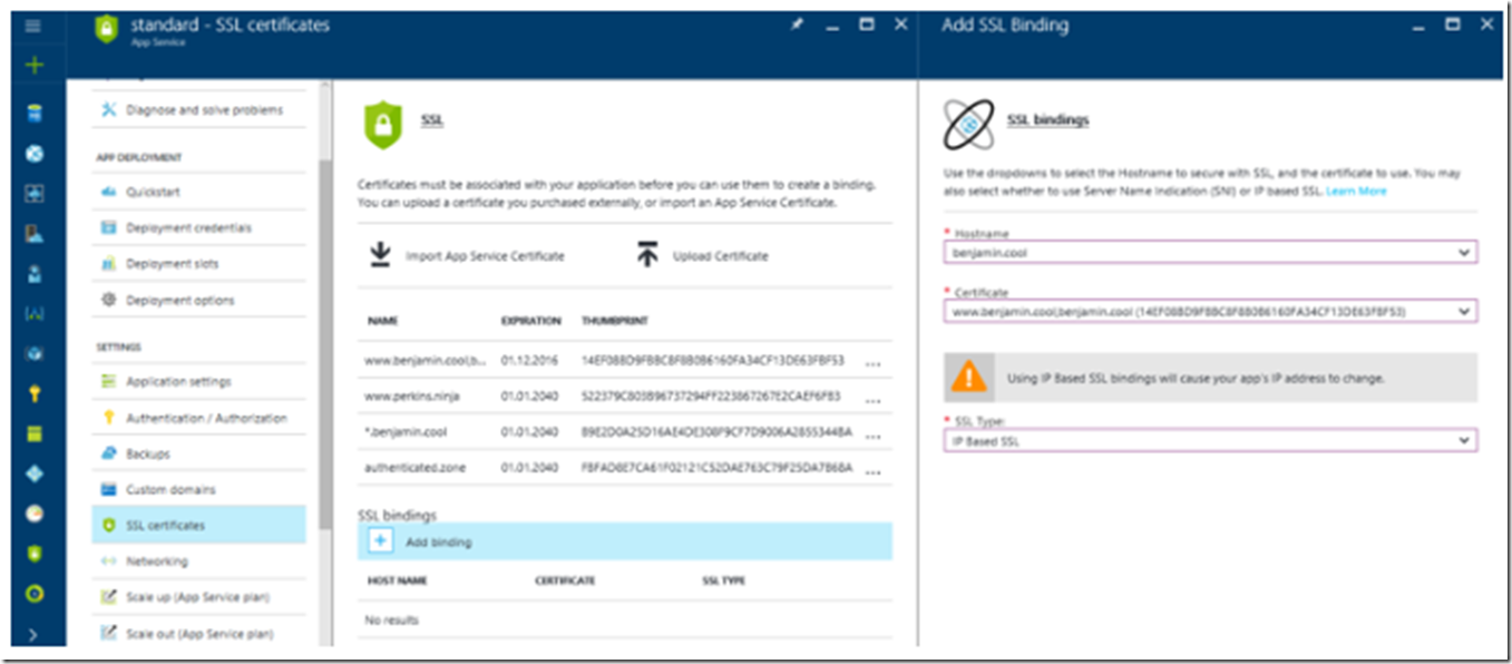 Figure 4, configure an IP based SSL self-signed certificate Microsoft Azure Web Apps