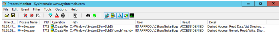 1. Right-click on the c:\windows\system32\mySubDir directory, Properties, Security tab, Edit and then Add. Make sure the Locations is set to the local server. Add IIS APPPOOL\CSharpGuitarBugs and click OK.