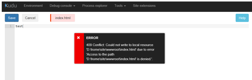 409 Conflict: Could not write to local resource 'D:\home\site\wwwroot\index.html'
