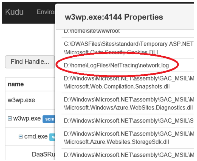 Figure 6, looking for open handles of you Azure Web App worker process