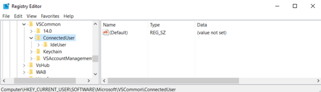 [HKEY_CURRENT_USER\Software\Microsoft\VSCommon\ConnectedUser]