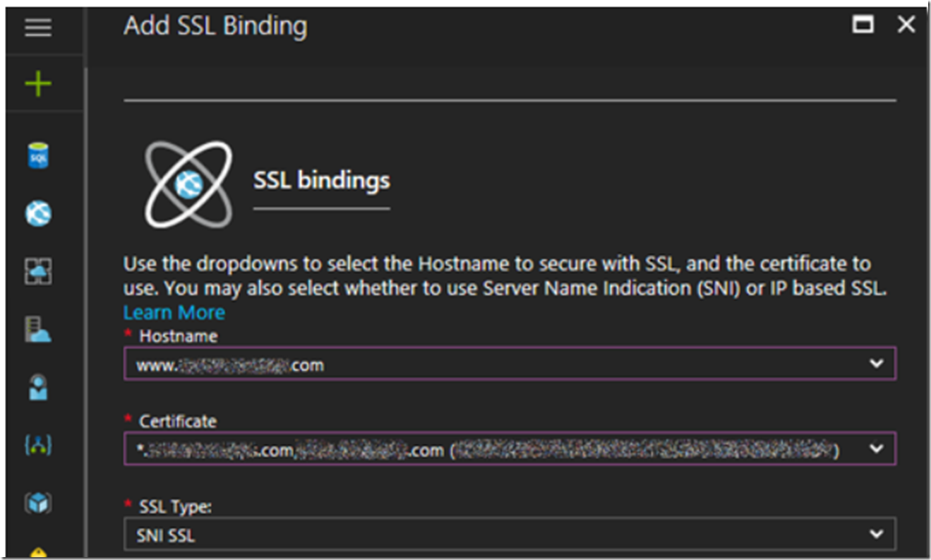 Once you see the SSL certificate in the list of available certificates, select the Add binding link. As shown in Figure 5, select the custom domain which you have already configured using either of these methods, here. Then select the App Service Certificate you just imported from Figure 3.