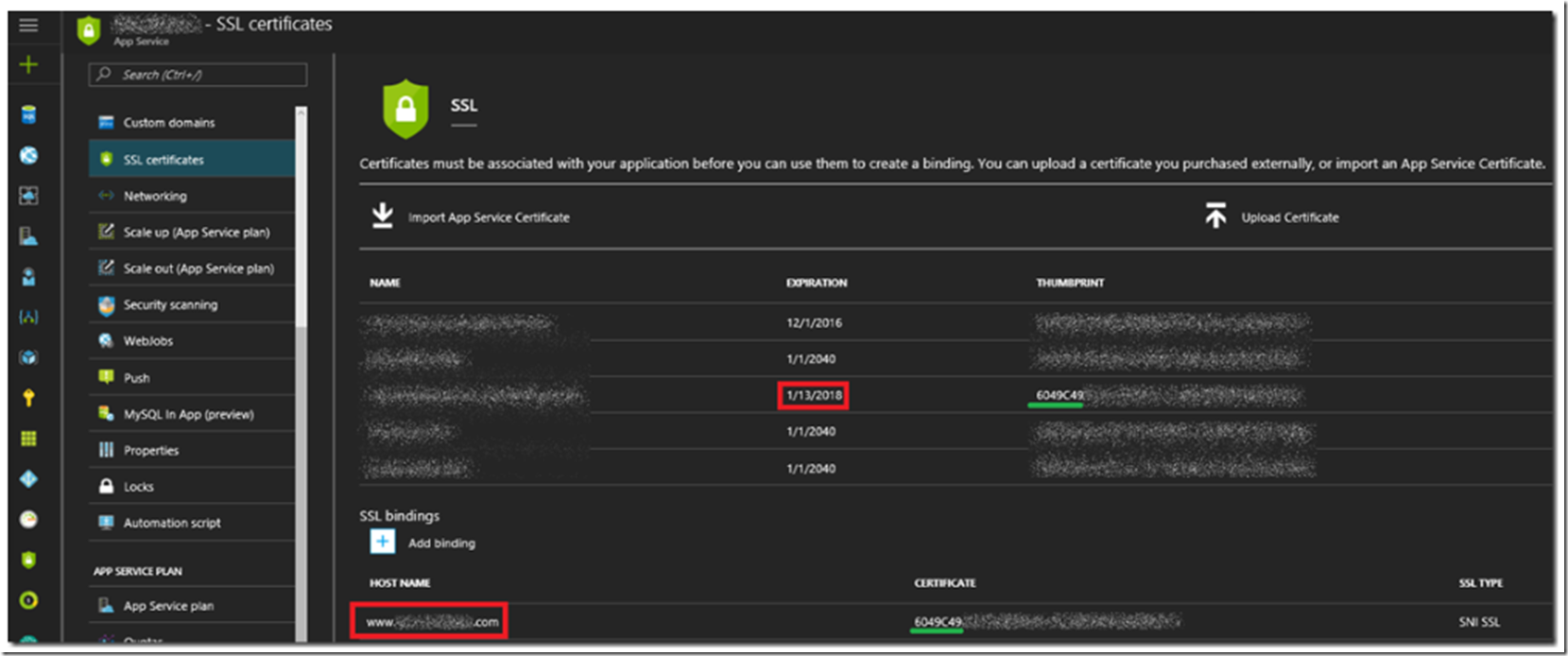 As shown in Figure 4, you will see the new SSL Certificate imported for binding to an Azure App Service.