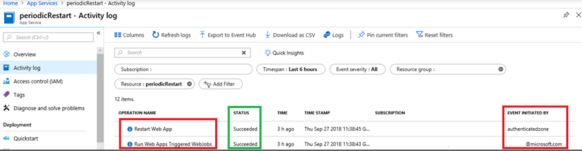 I explain how to deploy and run a .NET Core as a WebJob here “How to deploy a .NET Core console application to Azure, WebJob”. Make sure to add/include a run.cmd or one of the other file types required to run a WebJob. Once run, I can look in he Activity log of the App Service and see that indeed, the Web App was restarted, Figure 2.