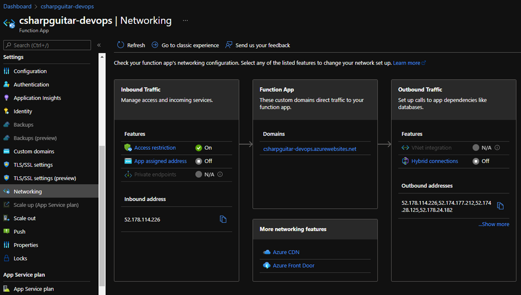 If you wanted to block inbound traffic to your Azure Function, one option is to use an Access Restriction. To check if you have one, navigate to the Networking blade for your Azure Function and check if Access restriction is On.