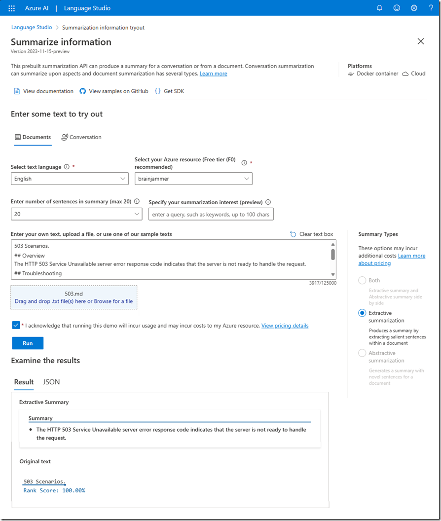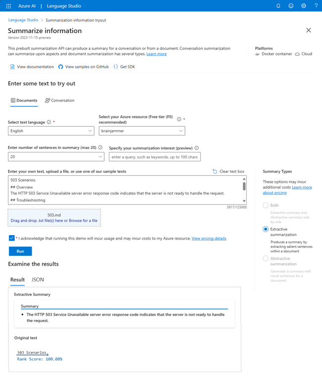 The summarization of the document is very straight forward, you either enter the text content into the text box, or you can upload a file which results in the contents being placed into the text box. Press the Run button to perform the summarization.