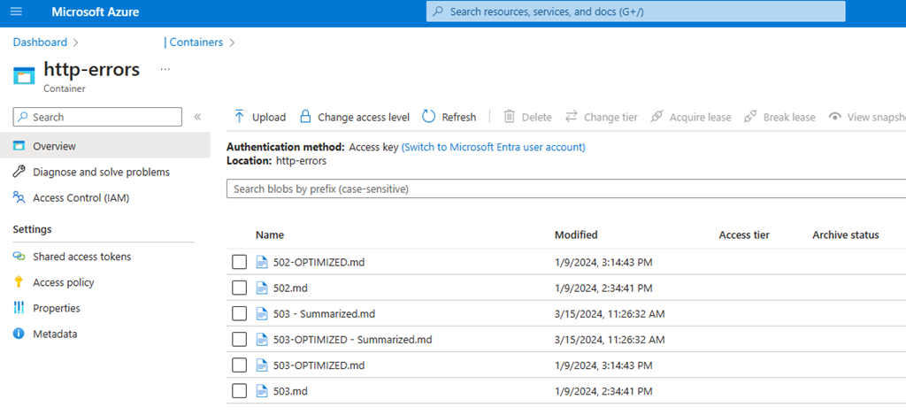 The file that was summarized was a simple Azure DevOps wiki file that contained information about HTTP 503 errors. The file, 503.md, was in raw form and contained all the markdown tags, tables, and white space you would expect to find in a wiki or markdown file. I also did some manual optimization to that file like removing all the tags, white space and other unnecessary content and created a new file named 503-OPTIMIZED.md. I copied the summary output by the action taken in Figure 4 into a copy of both the files and renamed them to 503 – Summarized.md and 503-OPTIMIZED-Summarized.md and uploaded them into my Azure Blog Storage container, as seen in Figure 5.